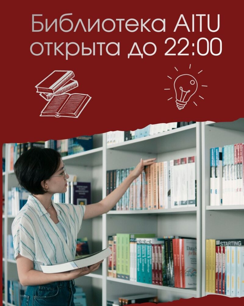 Рады сообщить, что теперь наша библиотека открыта для студентов и сотрудников университета до 22:00. У вас есть больше времени для учебы, работы с книгами и электронными ресурсами.