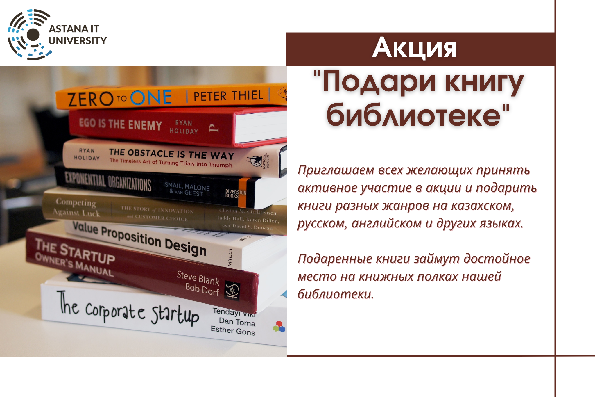 В Научной библиотеке Astana IT University стартовала акция «Подари книгу библиотеке».